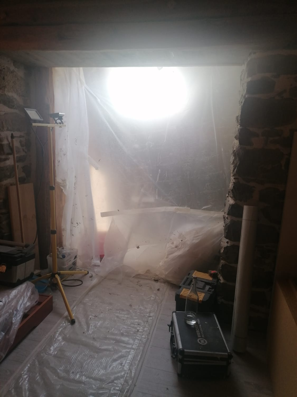Des éclaboussures d’enduit apparaissent, des traces mènent jusqu’à la salle de bain pour l’eau.