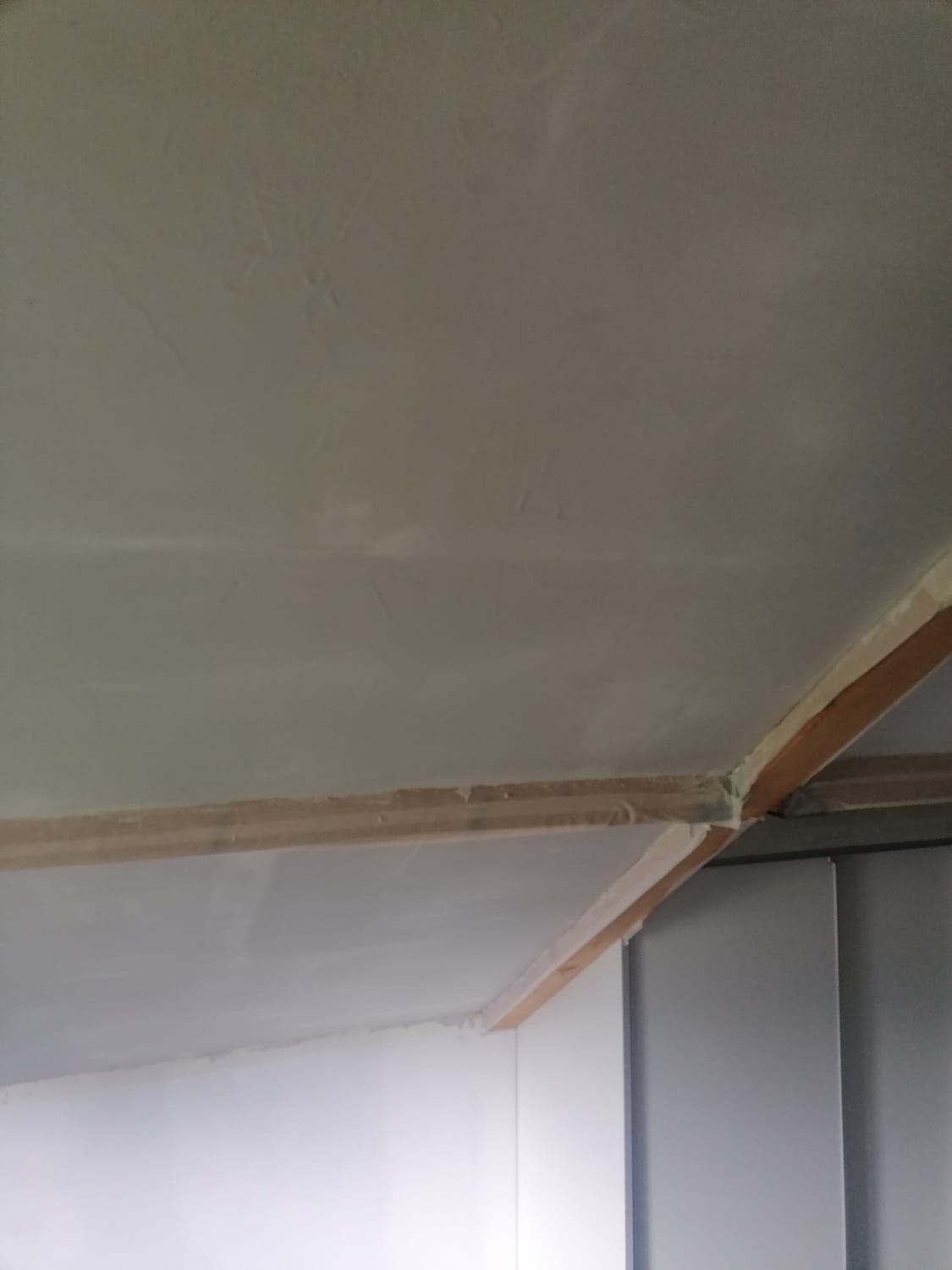 Maintenant que la fibre de bois est posée, on recule d'un pas pour regarder l'ensemble... et le constat est immédiat : impossible d'en rester là. Rondelles blanches bien visibles, angles irréguliers, et discontinuités entre les plaques et les murs... Techniquement, c'est ok. Esthétiquement, non. L'évidence s'impose : il faudra un enduit à la chaux pour protéger et unifier.