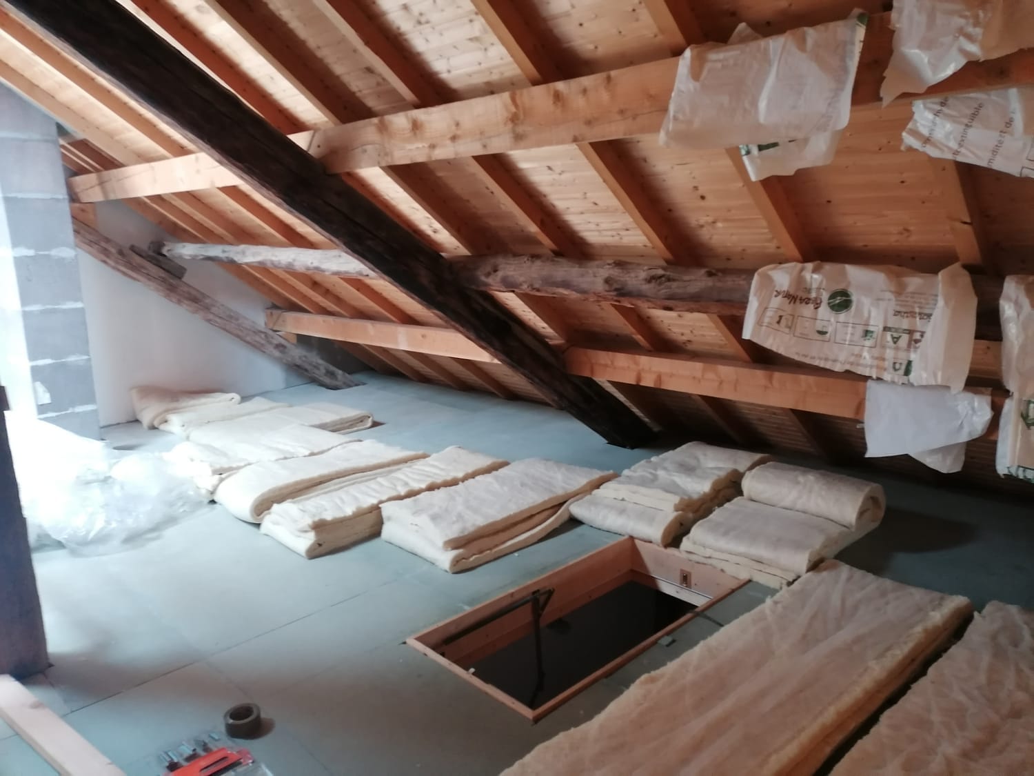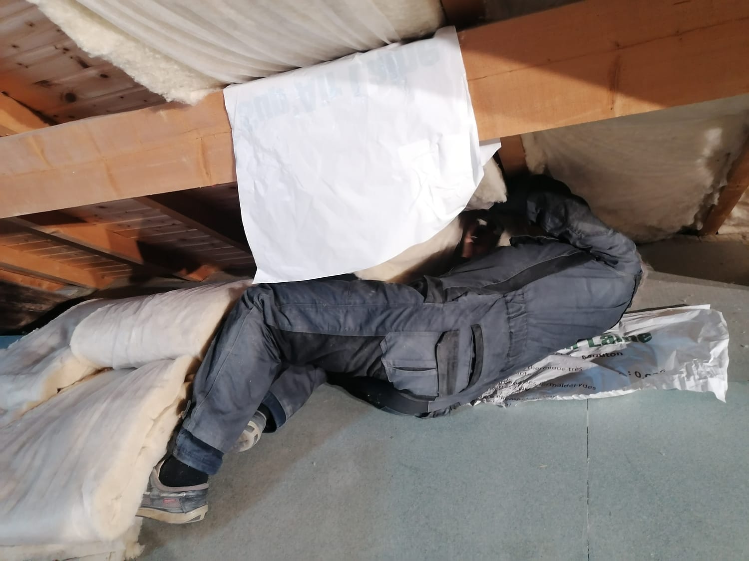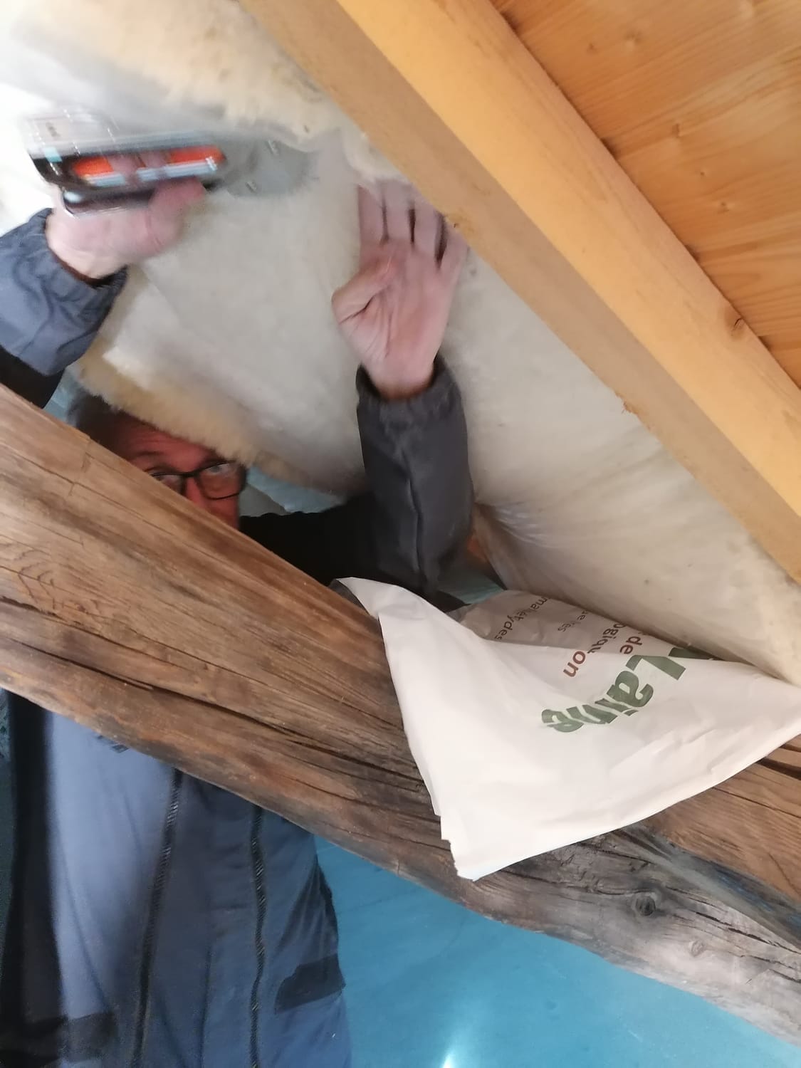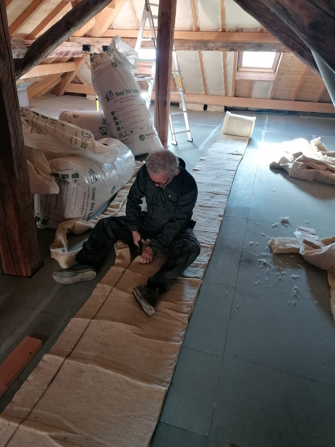 Commence alors un vrai travail de découpe, en longueur et en largeur, pour remplir chaque bande du faîte jusqu’au mur.