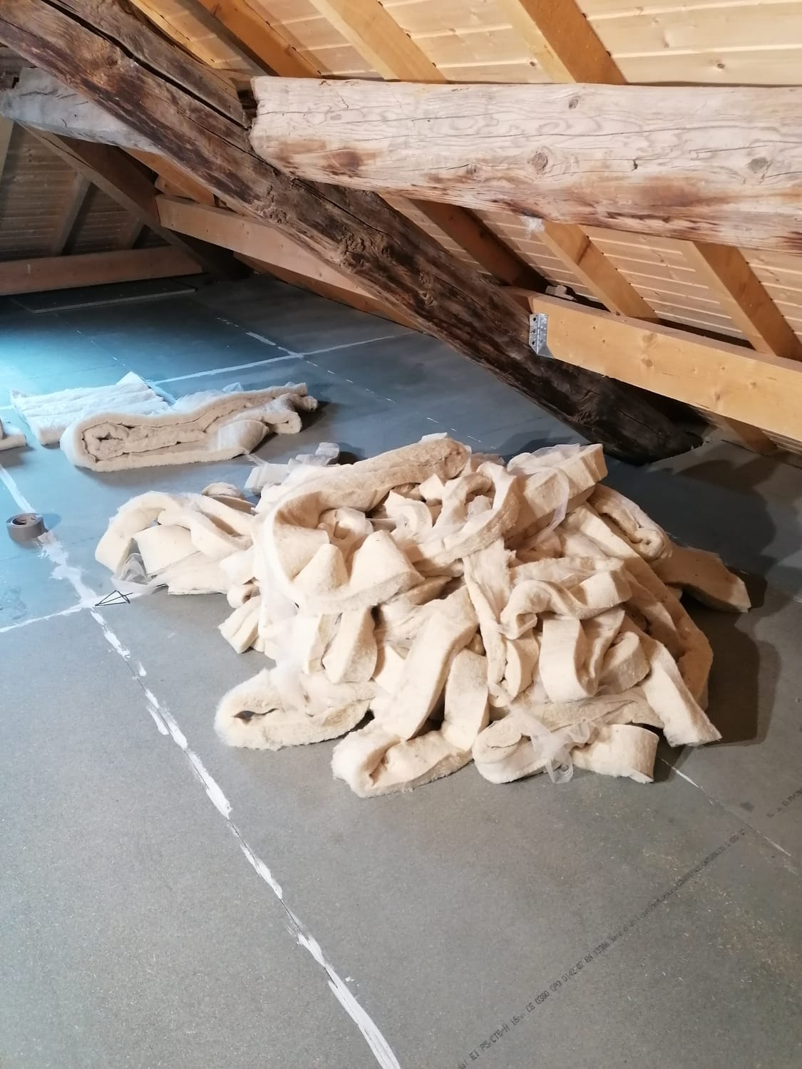 les bandes de laine découpées sont posées en attente, sous leur emplacement,