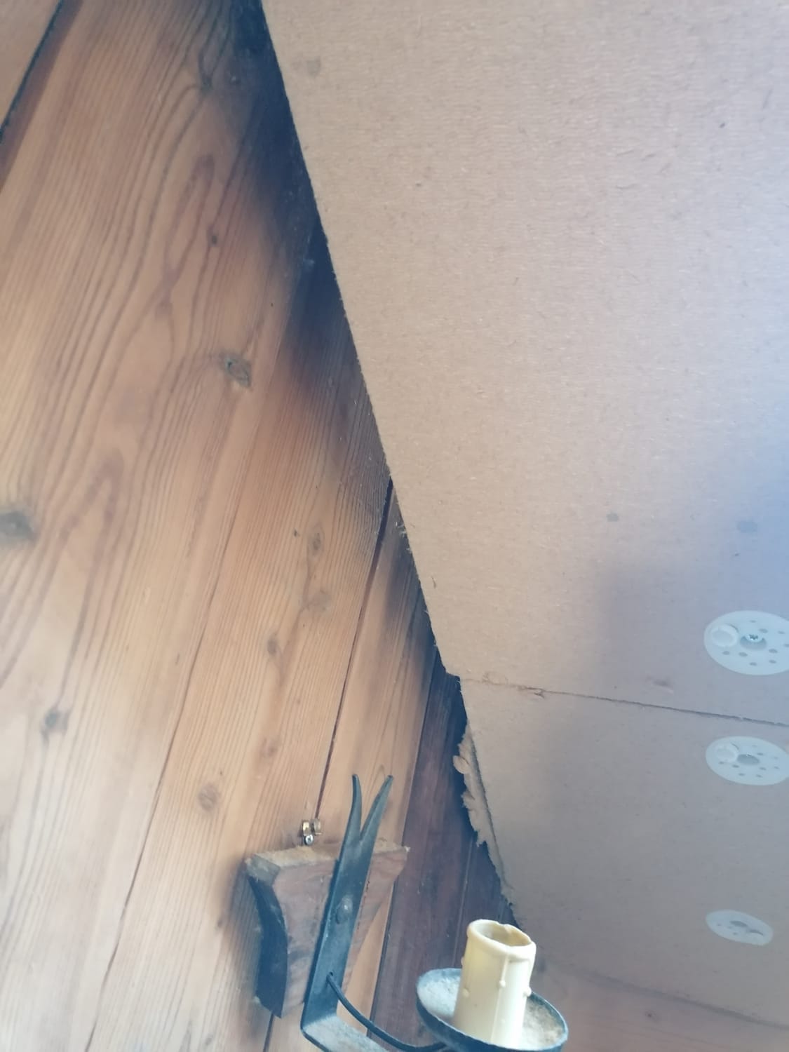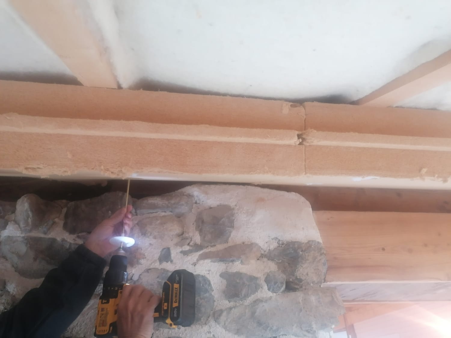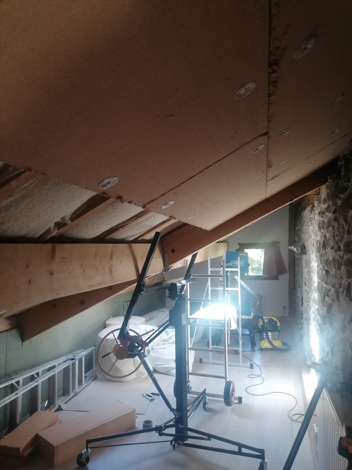 Nous apprenons donc un nouveau ballet : poser la plaque à deux, la maintenir seule quelques secondes, le temps que l’autre attrape la visseuse, puis fixer avant que tout ne s’effondre. C'est là qu'on se souvient que les arrêtes des plaques peuvent être friables...