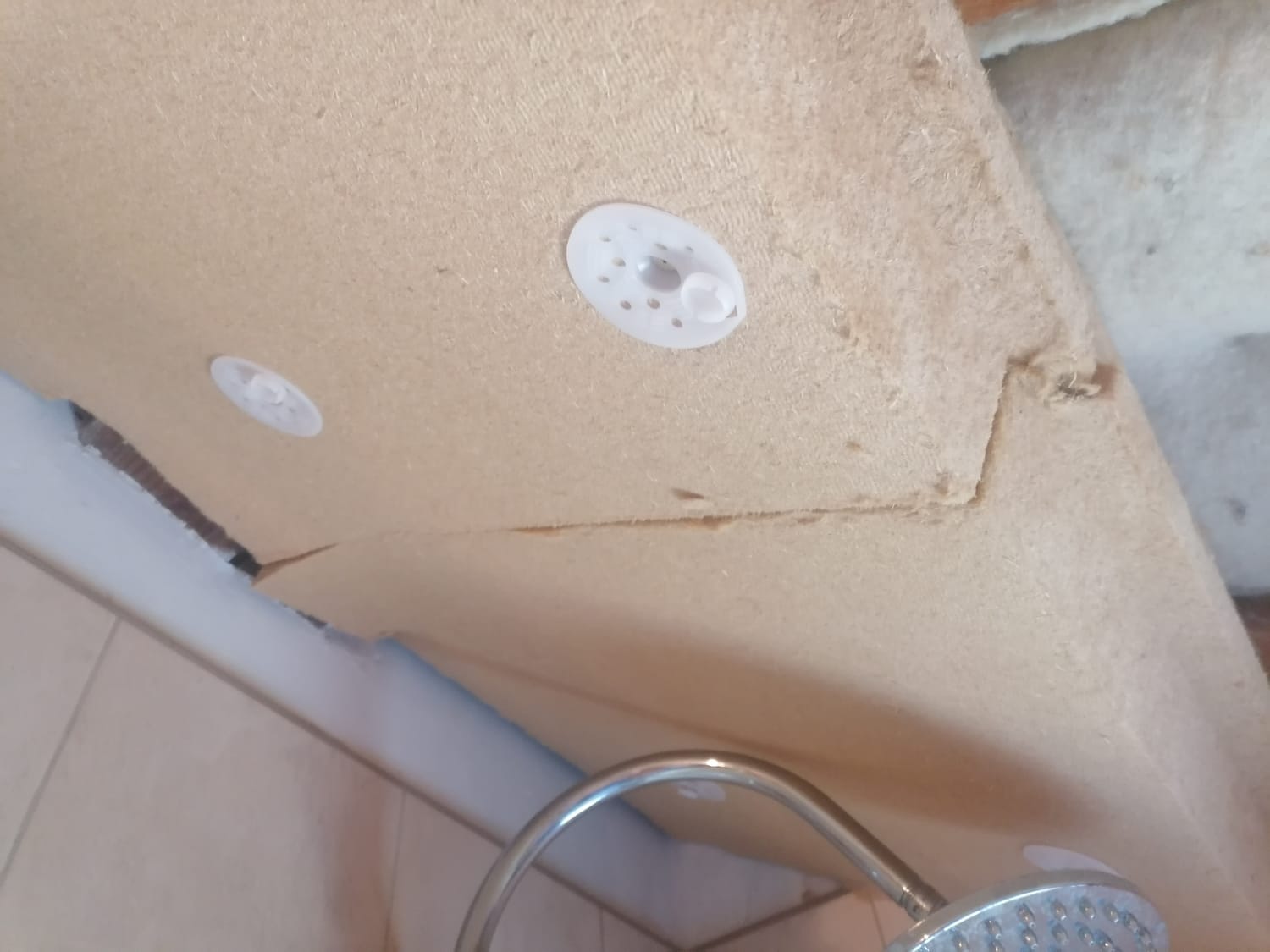 De son côté, la douche passe sous les 16 cm de fibre de bois… au millimètre près. Ouf.